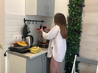 skinny teen masturbates with banana in kitchen solo