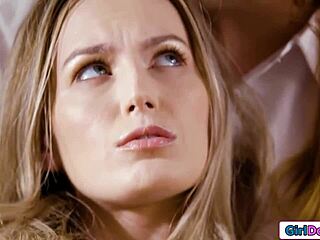 Blonde and brunette porn stars dominate with strapon in wild play.