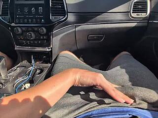 Girlfriend's messy car handjob ends in huge public cumshot