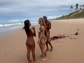 Friends fuck bareback on nudist beach with crowd watching. Jasmine Santanna and crew go wild!